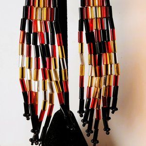 Offered are a pair of Navajo earrings by Ann Yazzie in red, black, gold and silver. They're a nice 3 1/2 inches long with elegant flash. The woven spread is a little over a/s inch wide and the beads flare out at the bottom to over twice that. Be sure to look at my other unique listings; nothing comes from box stores. I do combine postage without adding fees. Postage will be more only if the box is over 15 inches in a diameter or the weight makes the price go up. I normally ship Priority, but if you'd like something else, tell me before you pay. Sorry, no returns; have had far too many broken things returned that I’ve had to pay for.