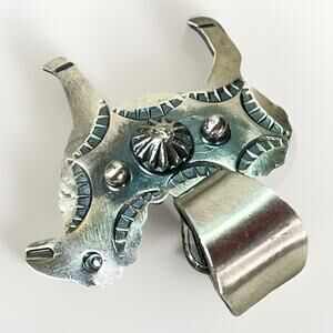 Brand new Navajo sterling silver sheep pendant handcrafted and signed by Chimney Butte. Made in traditional Navajo style with detailed stampwork, scalloped edges, raised repousse concho, and silver bead accents. The large bail accommodates various chains or bead strands. Signed on the back and tested sterling. A high-quality contemporary Native American artisan piece.