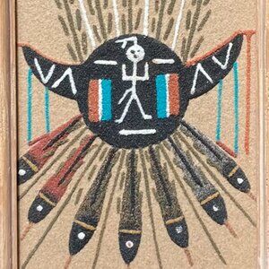 This vintage Navajo Native American Indian art sand painting, showcases the rich cultural heritage and artistic traditions of the Navajo people. The use of sand in the creation of this piece is a traditional practice. Made in the U.S., this unique piece offers a glimpse into the Native American culture and showcases intricate details and symbolism. This sand painting is a meaningful collectible that holds historical significance and reflects the craftsmanship of the artisan, making it a valuable addition to any art or Native American collection.