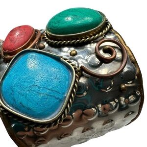 This bracelet contains three chunky stones with patina metal accents. The blue turquoise stone measures approximately 1" x 1"; the green stone is 1.25" x 1"; and the coral pink stone is 1" x 0.5".
