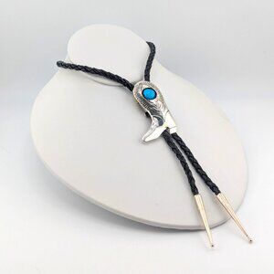 A western cowboy boot style Navajo bolo tie. Made of sterling silver & Kingman Turquoise stone. Genuine leather with sterling silver tips. Handmade by Navajo artisan Shirley Skeets. Traditional tribal artwork, intricate details. Collectible quality Native American jewelry. Marked with "Sterling" on the back.