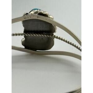 A beautiful bracelet measuring approx. 6.5 inches and the cuff is 1 inch wide. The two turquoise stones are gorgeous inset into the elaborate sterling. Weighs 14.3g. Stamped with "Max C." for Max Calabaza, a well known Navajo silversmith. This piece is in excellent condition. A beautiful example to add to your collection.