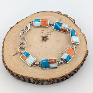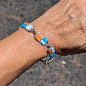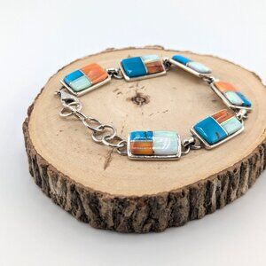 Each link of this bracelet is a celebration of nature's beauty, featuring a captivating combination of gemstones including red and orange spiny oyster, mother of pearl and turquoise. The warm hues of the spiny oyster, the cool tones of turquoise, and the unique allure of mother of pearl come together in perfect harmony, creating a mesmerizing mosaic of color and texture. Beautifully Handcrafted and signed by a Navajo Artisan, Edward Johnson.