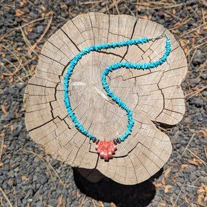 This is a gorgeous handmade Navajo necklace with Sleeping Beauty turquoise nuggets and graduated corn cut Red Spiny Oyster. Hook and eye closure.  Elegant and beautiful Southwestern collectible quality jewelry. Outstanding workmanship. Colors are so vibrant and naturally coordinated. Handmade by Native artisan Valarie Johnson. A traditional Native American work of art that was passed down from their ancestors.