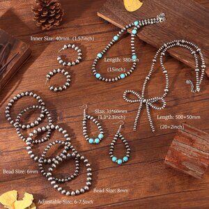 Features: This Southwest-inspired jewelry set includes a Navajo pearl bow necklace, a Navajo pearl choker, two pairs of matching Navajo pearl earrings, and five Navajo pearl bracelets. Crafted with 4mm faux Navajo pearls in a classic black, the set offers versatile layering options. Perfect for dressing up casual looks or adding a touch of elegance to formal outfits.