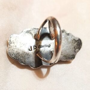 Highly detailed signed JR = RALPH JOHNSON Vintage Navajo Sterling Silver Ring. The Artist signed piece of Art is beautiful with the Flower, Leaf and Swirls. It weighs a Quality 6.22 grams and is a size 4. The top portion measures 1 & 3/8" long. In excellent Vintage condition. A wonderful piece of History to add to your Heirloom Collection. The last RALPH JOHNSON I saw sold on another site, went for $697. This is a Great Deal.