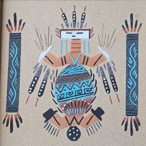 This handmade Navajo sand art showcases a captivating depiction of traditional tribal motifs, carefully crafted with intricate detail and vibrant colors. Encased in a natural wooden frame, the piece is signed by the artist, adding authenticity and a personal touch. Ideal for those who appreciate Native American artistry.