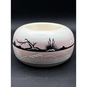 Navajo Signed Ann Etched Pottery Candle Holder Native American Wolf