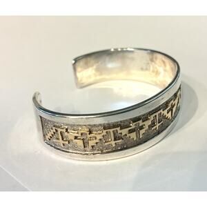 The artist of this cuff bracelet, Tommy Jackson (b. 1958) is a highly regarded Navajo silversmith known for blending traditional Native American motifs with modern gold and silver overlay.