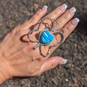 A gorgeous Native American Sterling Silver & Turquoise Ring. Elegant and beautiful Southwestern collectible jewelry. Meticulously handcrafted and signed by skilled Native American artisan Lester James. The premium sterling silver setting enhances the vibrant pink conch shell hues, creating a striking contrast that makes this piece a standout accessory.