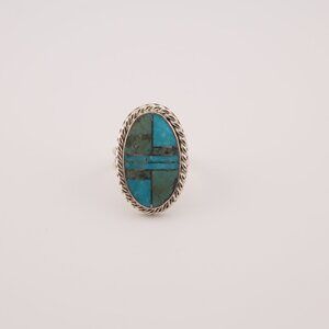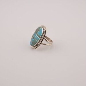 Navajo Sonoran and AZ Blue Turquoise Inlay Ring Signed Handmade NA Sz 8.25US**
