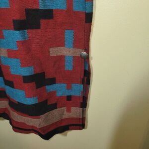 Item: beautiful red rug dress designed by award winning Navajo designer Virginia Yazzie-Ballenger and sewn by Navajo workers in New Mexico, side slits, button details on neckline and sides, size XL and originally $505