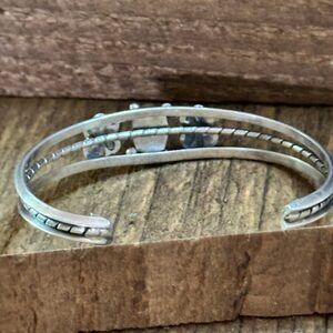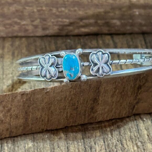 This Navajo sterling silver cuff bracelet features vibrant Kingman turquoise stones arranged in an elegant floral design. Expertly crafted with traditional stamping techniques, it reflects authentic Native American artistry. Delivered in a gift box, this piece combines cultural heritage with refined style, making it a distinguished accessory for collectors and enthusiasts alike.