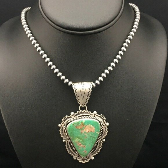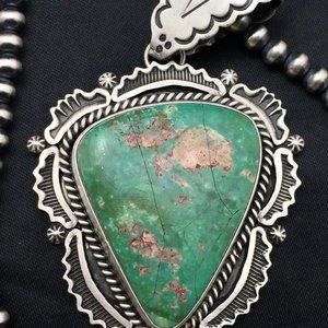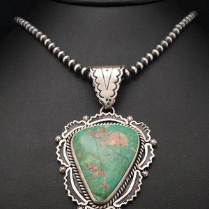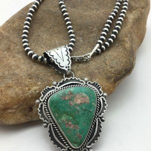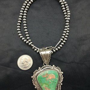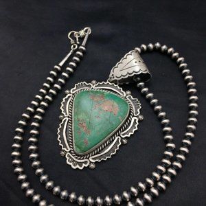 • Native American Sterling Silver Necklace with XL Green Royston Turquoise Pendant and Navajo Pearls Necklace.