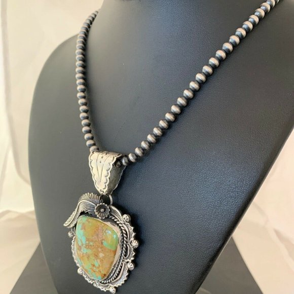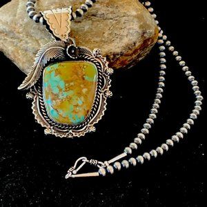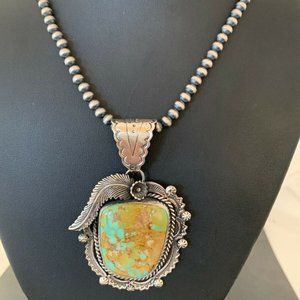 • The Royston Turquoise Necklace and Pendant has a beautiful matrix, with a strand of Silver Beads add this Signed pendant necklace a class of its own.