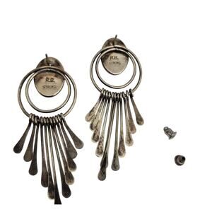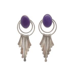Striking Native American sterling silver earrings signed R.B., Rita / Richard Begay. The dangle earrings featuring vibrant purple stone cabochons! These impressive earrings showcase traditional Southwestern design with cascading fringe / paddle elements and double hoop accents.
