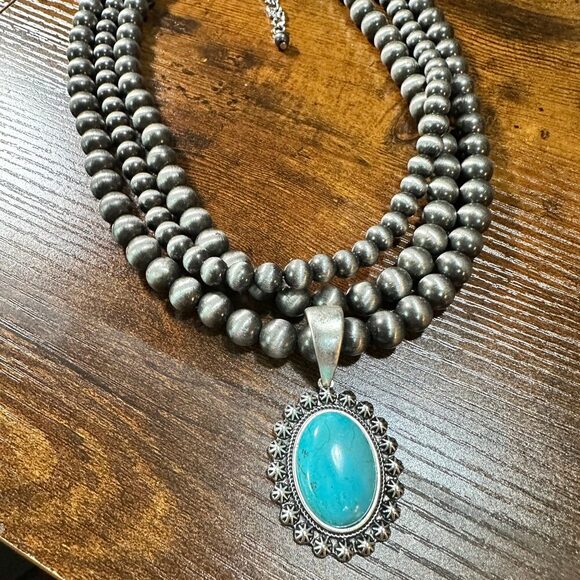 Discover the captivating beauty of the 738164, Navajo Turquoise Necklace, a stunning 18" long, 3-strand masterpiece designed to elevate your style. This exquisite necklace features a vibrant turquoise pendant that embodies the essence of Native American artistry.