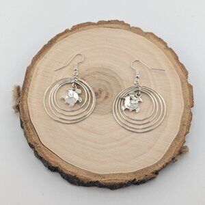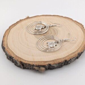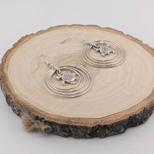 Elevate your style with these stunning Native American Turtle Dangle Earrings, meticulously handcrafted and signed by skilled artisan, Edith Kee. Silver plated French wire closure. These earrings feature intricately detailed turtles, symbolizing protection and longevity in Native American culture, suspended within a series of elegant, graduated silver rings.