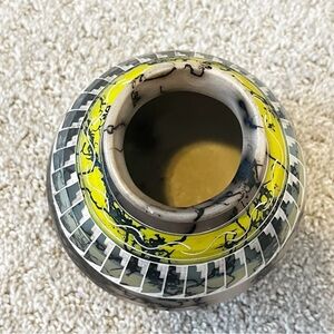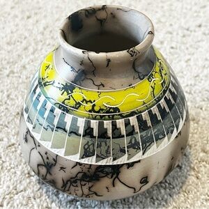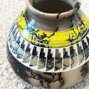 Navajo Vase Pottery Horse Hair Artist Signed Tan Black Lime Green Small Etched