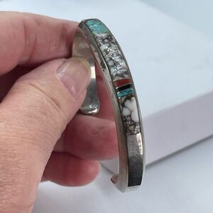Navajo Artist Wilbur Muskett “Muskett Sterling“ Multistone thick silver cuff bracelet. Thick chunky silver cuff that will not bend. Please use measurements. Inlay design of Turquoise, coral, silver and others. Clearly stamped on inside. Pictures are part of description.
