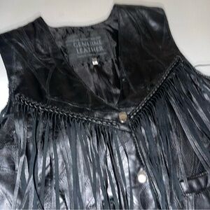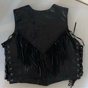 Stylish black leather vest with fringe details. Perfect for a bold look.