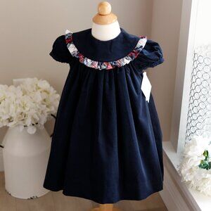 This Adorable Little Navy Dress by Bailey Boys is a Classic!!! The dress in done in a traditional Navy Blue and is made of 100% cotton, pin wale corduroy- super soft and cuddly! The float style dress has an oversized collar that is trimmed in a beautiful red, blue and white plaid ruffle. The short puff sleeves have a 1/2" matching corduroy band for a tailored look. The front and back top have a yoke, the back having a 2 button closure. The dress is lined with a white slip and has a small tier of tulle to add a touch of volume. PERFECT FOR MONOGRAMMING!! Great for transitioning into Fall/Winter seasons. Perfect little dress for Portraits, parties, church or other special occasions. Pair with a big white hair bow, white tights and black Mary Janes for a Classy, Traditional look!! Perfect little dress. New With Tag.