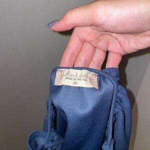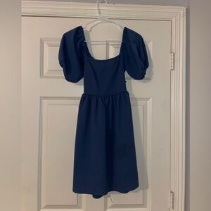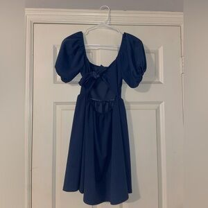 Navy dress in a stretchy and comfortable material, in excellent condition. Has an open back with a bow that ties to your liking for fit