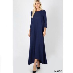 Navy Blue 3/4 Sleeve Maxi Pocket Dress