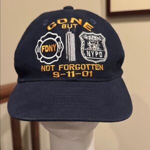 Navy blue cap featuring 9/11 tribute embroidery with FDNY and NYPD logos.