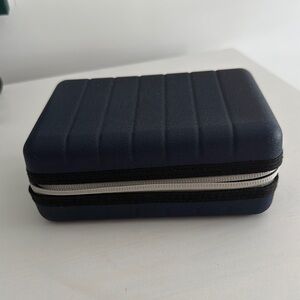 Navy blue Away travel box with amenities: sleep mask, Sunday Riley unopened face cream, hand cream, and lip balm, United pen, ear plugs, and a packet of tissues. Box is very handy when traveling. Use it for toiletries, or medicines, even jewelry.