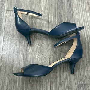 Chic navy blue heels with ankle strap. Peep toe design. Ideal for elegant outings. Nine West Size 9 Excellent Condition!