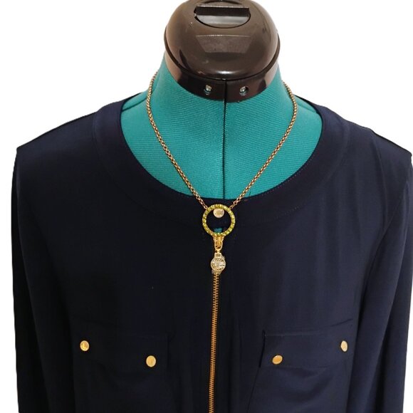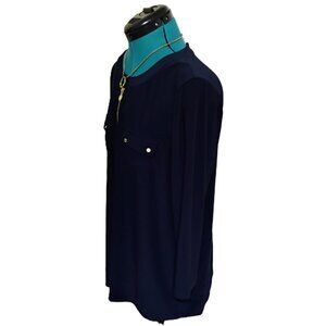 The Anne Klein navy blue blouse in size large features long sleeves that can be worn down or rolled up, and it has a gold fourth zipper in front.