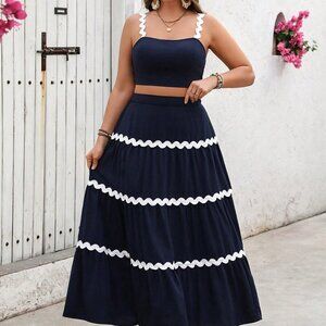 Navy Blue Boho Women's Plus Size Ruffle Trim Camisole And Mini Skirt Set