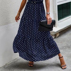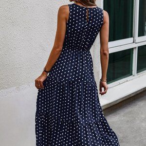 Navy Blue Boho Womens Polka Dot Sleeveless Ruffle Hem A-line Dress