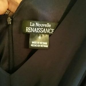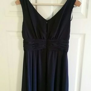 Dark navy blue bridesmaid dress. I am 5'9, 130, and this hits me at my knees. Size 6, so it was a little roomy on me. Brand is La Nouvelle