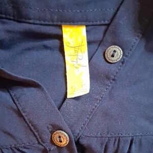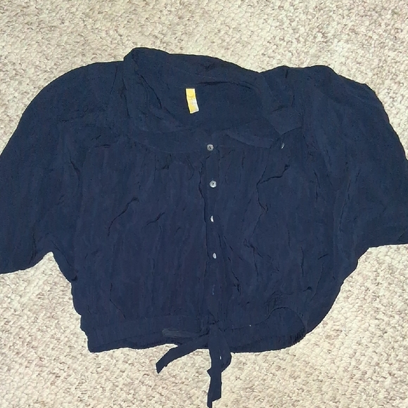 Stylish navy blue button-up blouse with a tie front. Perfect for casual or formal occasions.