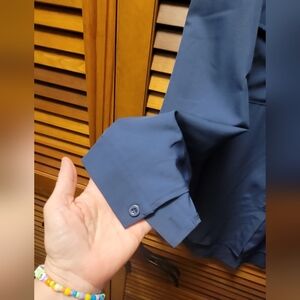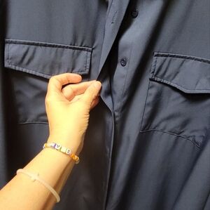 Stylish navy blue button-up shirt with front pockets. Perfect for casual or formal wear.