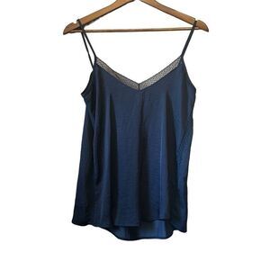 Keywords: cami top, tank top, sleeveless blouse, navy blue, lace trim, satin cami, women's top, casual top, dressy cami, summer top, lightweight top, blouse, party top