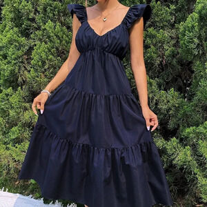 Navy Blue Casual Women's Loose Spaghetti Strap Flutter Sleeve Midi Dress
