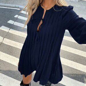 Navy Blue Casual Women's Pleated long sleeved mini Dress