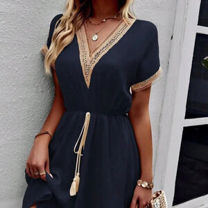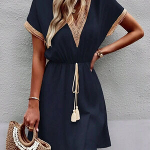 Navy Blue Casual Women's Stylish Summer V-Neck Fringed Belted Dress
