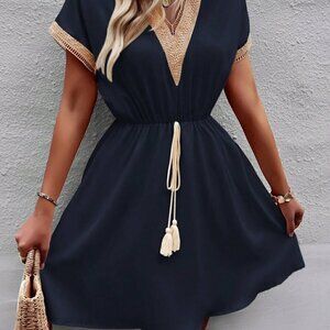 Navy Blue Casual Women's Stylish Summer V-Neck Fringed Belted Dress