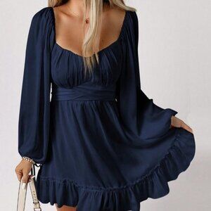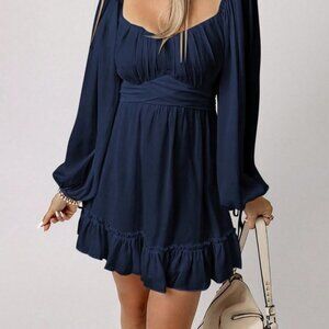 Navy Blue Casual Womens Sweetheart Neck Lantern Sleeve Ruched Bust Ruffle He…