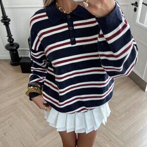 Navy Blue Casual Women's collar Striped knit Sweater top