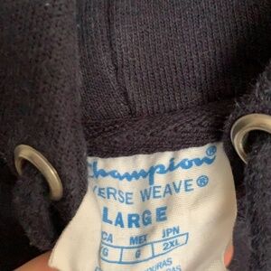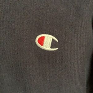 Navy champion hoodie, in good/fair condition. No tears. Some fading from wash wear.