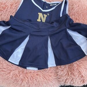 Navy blue cheerleading uniform featuring gold and white accents. Includes matching bottoms. NAVY cheerleading outfit
