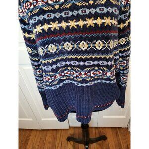 Navy blue chenille sweater by Planet & Company is made of a lovely, comfy chenille. Sweater features a Fair Isle design with tones to light blue and brown. Great for Winter weather.