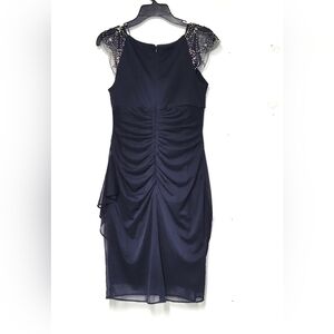 Navy Blue Cocktail Dress with Beaded Illusion Neckline – Elegant Party or Formal Dress - Shine at your next event in this navy blue cocktail dress featuring an illusion neckline with intricate silver beadwork and a flattering draped overlay. The sheath silhouette hugs curves while the ruching detail creates a slimming, elegant look. Perfect for weddings, cocktail parties, or formal evenings.