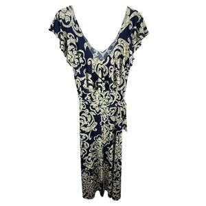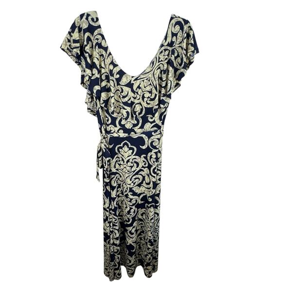 Navy Blue Cream Scoop Neck Ruffled Neckline Belted Stretchy Maxi Dress Size L