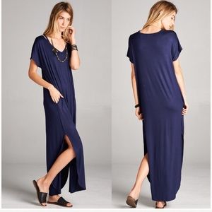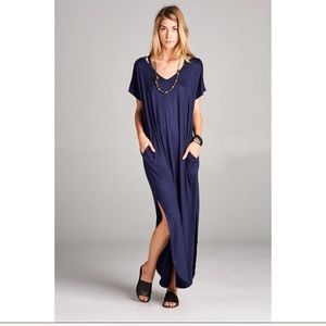 Navy Blue, v-neck, cut-out shoulder, pocket maxi.
